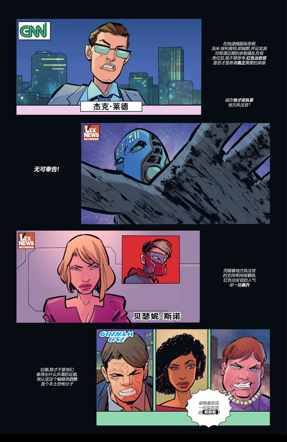 在全面未来态结束之后的未来态新刊 蝙蝠侠已死,但是哥谭市的众人似乎还对此毫不知情,而如今的哥谭天翻地覆,打击罪犯的责任落到了却落到了曾“杀死”蝙蝠侠的地方治安官的手上,曾经哥谭市的另一位义警,红头罩,在打击了罪犯后也遇到了这帮地方治安官,而他们所作所为将会永远改变哥谭市……